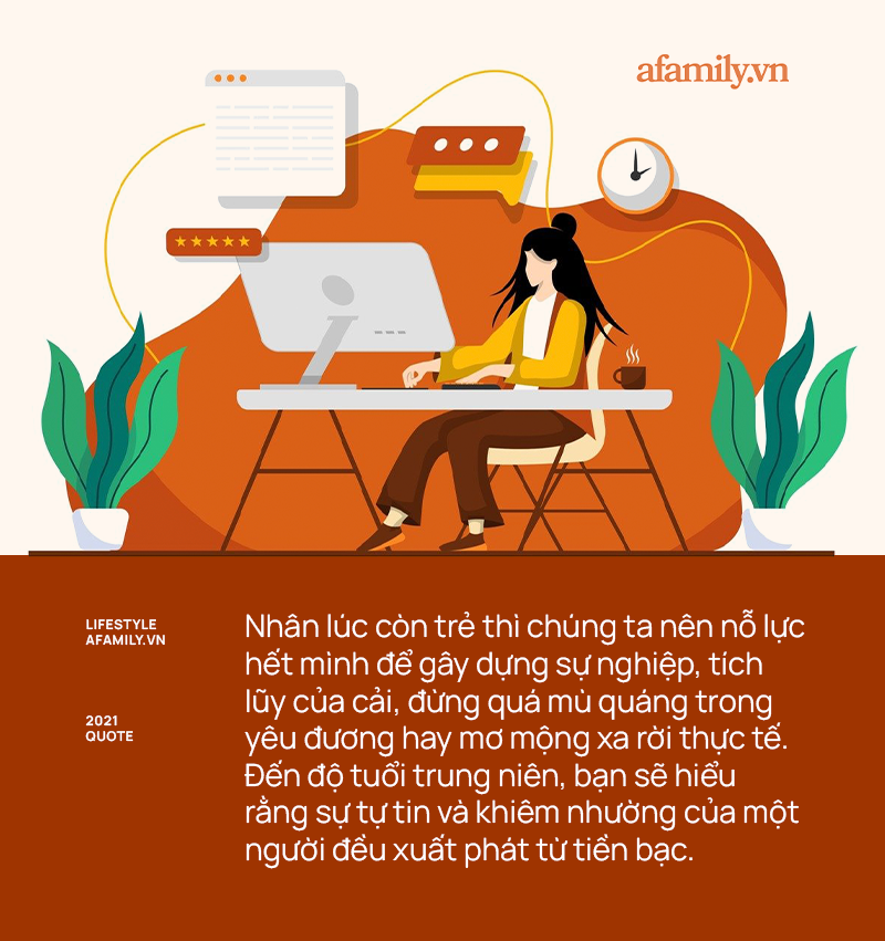 Chính vì vậy, nhân lúc còn trẻ thì chúng ta nên nỗ lực hết mình để gây dựng sự nghiệp, tích lũy của cải, đừng quá mù quáng trong yêu đương hay mơ mộng xa rời thực tế. Đến độ tuổi trung niên, bạn sẽ hiểu rằng sự tự tin và khiêm nhường của một người đều xuất phát từ tiền bạc.